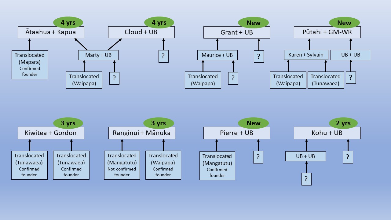 Of the 11 pairs spotted so far this year, 4 have been together for the last 3-4 years. Three are new pairs due previously paired kōkako splitting from last years’ partners to form new pairs this season. See the family tree below (click for bigger image) of all 8 pairs with banded kōkako. The other 3 pairs not shown are made only of unbanded (UB) kōkako, so we know that they were born at the Ark, but not their whakapapa.